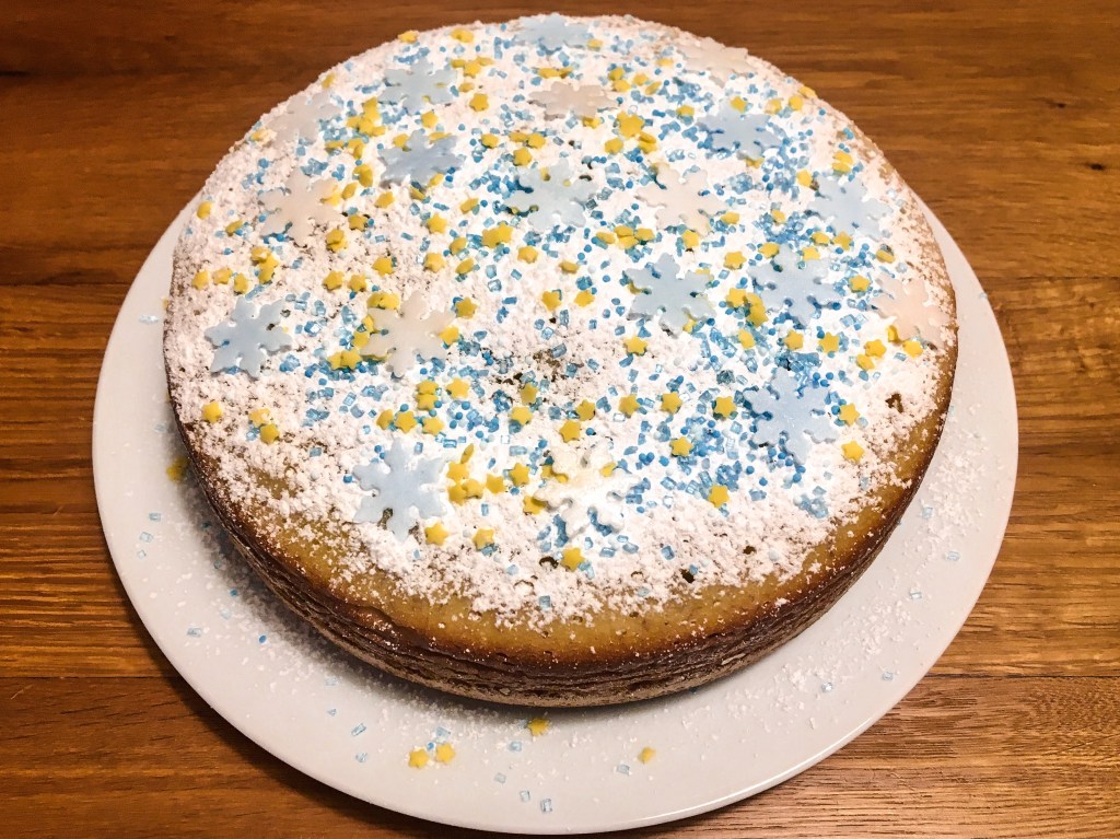Per le decorazioni che vedete nella foto io, come al solito, mi sono arrangiata con quello che già avevo in casa: zucchero a velo e granelle di zucchero e zuccherini a forma di cristallo di neve che avevo comprato qualche tempo fa al LIDL. Alla fine, senza nemmeno volerlo, mi sono ritrovata una torta a tema Frozen!
