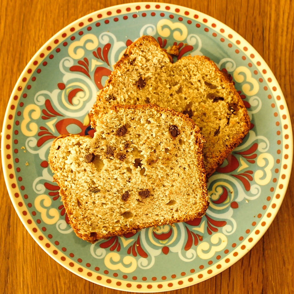 Banane, zucchero, yogurt, margarina (so che non è il massimo, ma in questo periodo bisogna un po’ accontentarsi!), farina, amido di riso, vanillina, lievito e gocce di cioccolato, mescolato il tutto, buttato nella teglia da plum-cake e infornato!