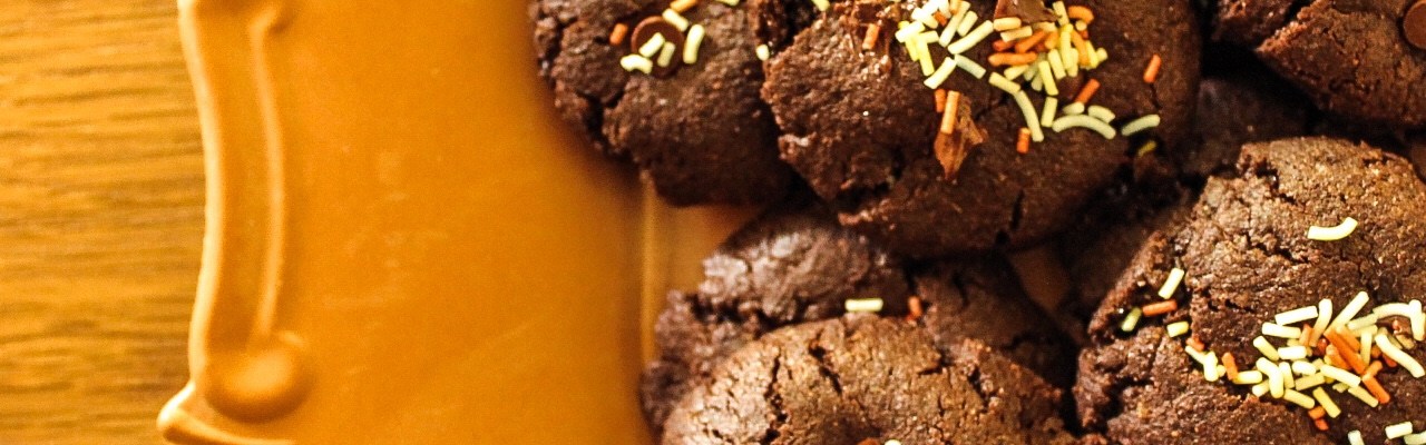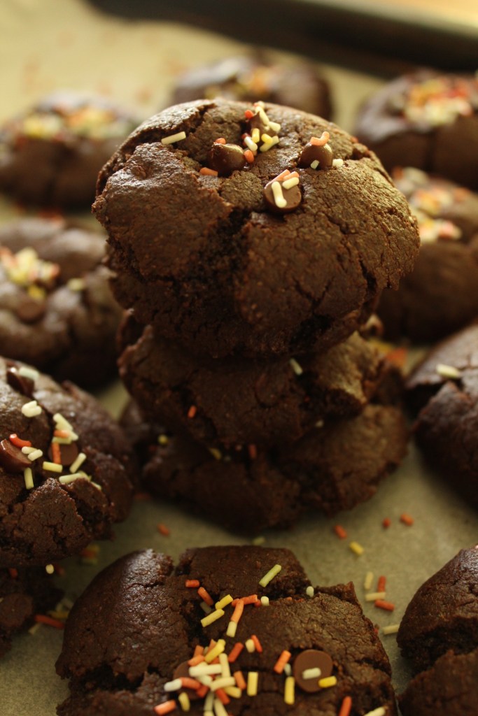 - Preparate l’impasto: con le fruste elettriche o una planetaria dotata di gancio a foglia, sbattete ad alta velocità il burro, lo zucchero semolato e lo zucchero di canna finchè non risulta cremoso. Mettete da parte. In una ciotola capiente mescolate a mano con una frusta la farina, la polvere di cacao, la vanillina, il bicarbonato di sodio e il sale. Versate ora gli ingredienti secchi sul composto di burro e zucchero e mescolate a bassa velocità o a mano finchè l’impasto non risulterà sbriciolato. Aggiungete ora il latte vegetale e mescolate sempre a bassa velocità o a mano finchè il composto non risulterà appena umido e sabbioso. Dovrà essere molto fisso. Aggiungete le pepite di cioccolato tenendone da parte per la guarnizione finale e mescolate. Formate ora delle palline di impasto e disponetele abbastanza distanziate tra loro su di una placca da forno ricoperta di carta forno.