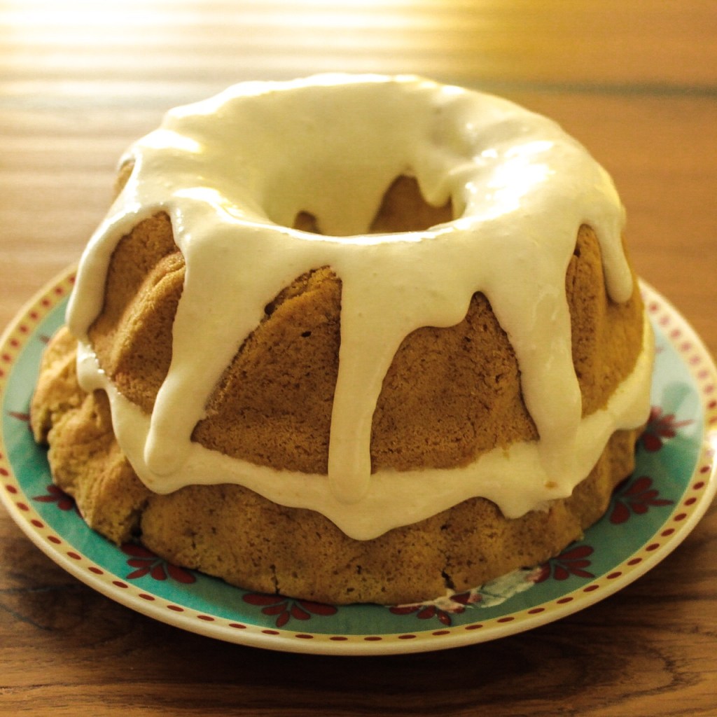 - Decorate la bundt cake: una volta completamente raffreddata, tagliate a metà la vostra torta e prendete la crema dal frigo. Cospargete con una quantità generosa di crema la metà tagliata che era alla base della torta. Ricomponete la torta appoggiando la metà superiore della torta sulla sua base appena ricoperta di crema e cospagete la cima della vostra torta sempre con una generosa quantità di crema in modo che abbia dei bei rivoli che scendono lungo i lati della torta. Mettete in frigo per 10 minuti e servite.